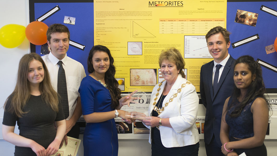 The Mayor’s Science Prize was won by Anila Viepadan, Maren Riseng, Jack Farley, Ria Sareen, Alexander Payne and Gregory Nocentini for the research project “To what extent does the kinetic energy of a meteorite affect the diameter of the crater?”