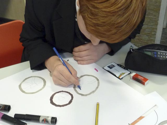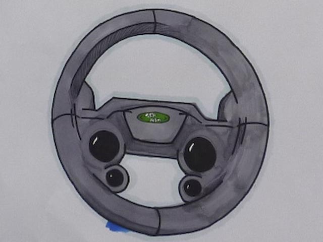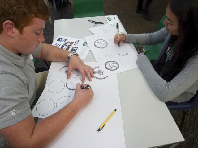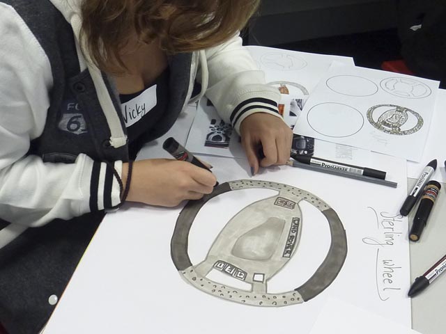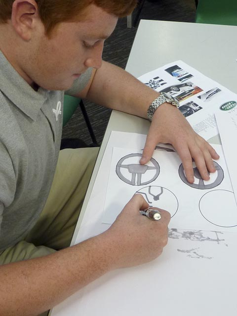 Students were put into groups of four or five and given 4 hours to design, refine and present their designs. There were team and individual prizes for the best teamwork, best design and best presentation. The individual prizes were drawings of the Evoque signed by the lead exterior designer. Group prizes were a lovely bag of sweets! Seven teams worked very hard to design a new steering wheel, wheels or lights. Whilst working Sean went around giving mini-master classes to students about design, drawing and 3D sketching.