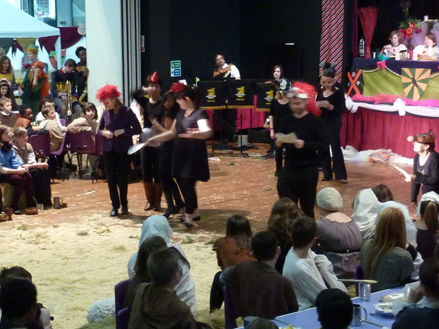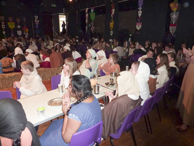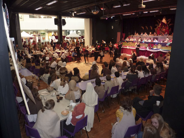 Each spring our year seven pupils get the chance to sample living in the middle ages. Organised by the food technology department, the majority of students are treated to a feast of pottage and bread with a lucky few eating more richly at the high table. An army of staff and older students provided everyone with a wide variety of entertainment from singing to recitals and short plays to juggling and magic.