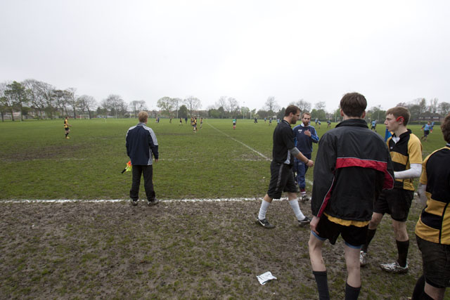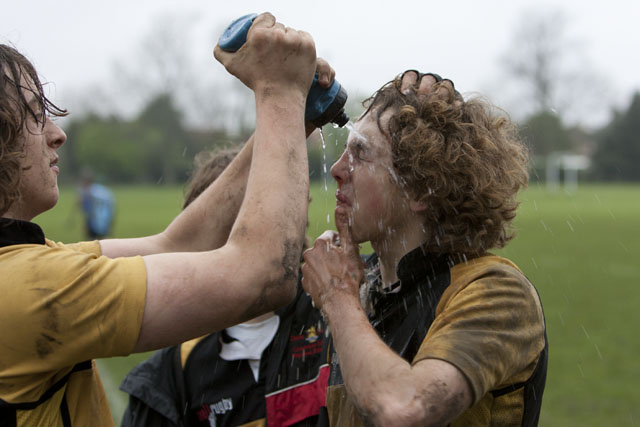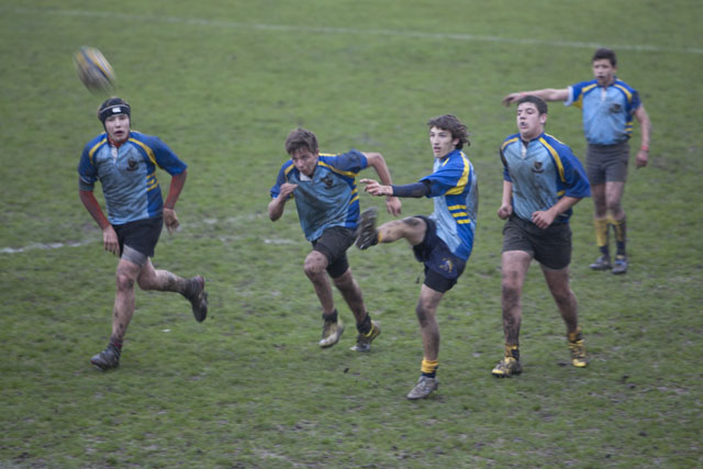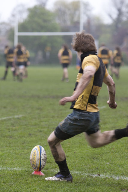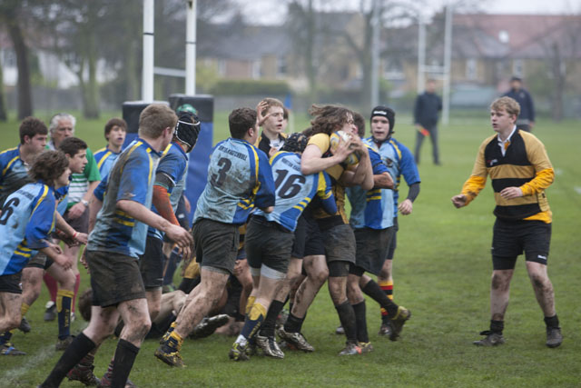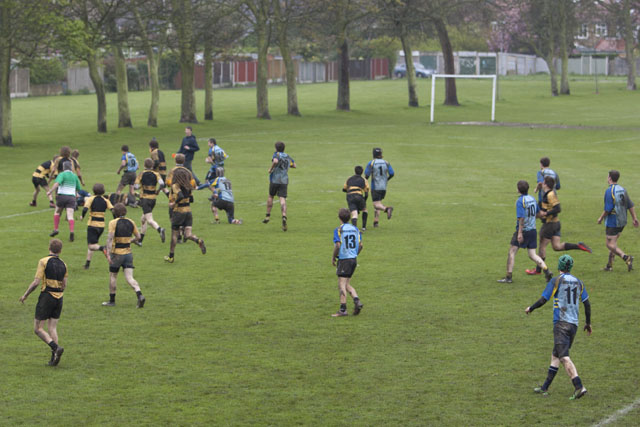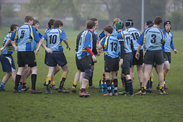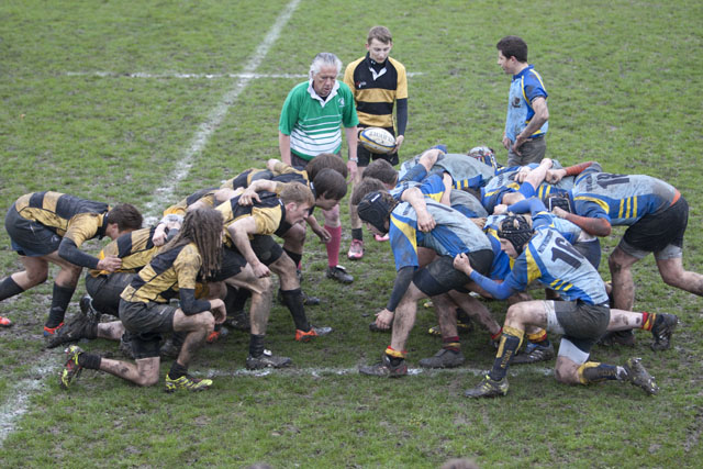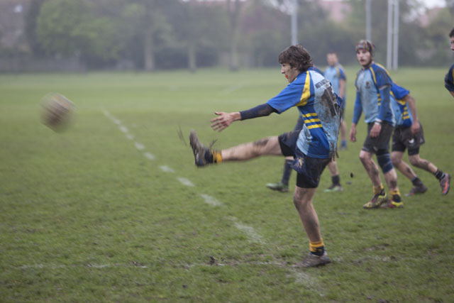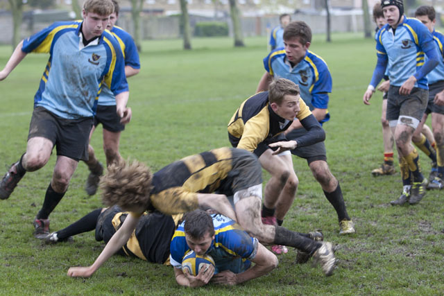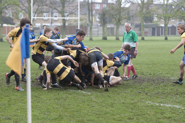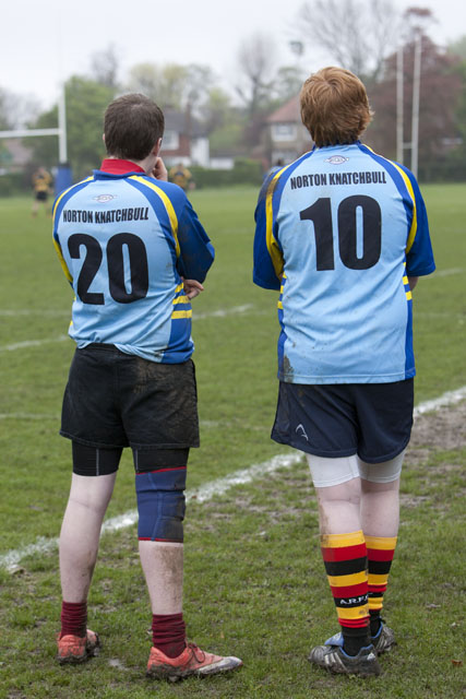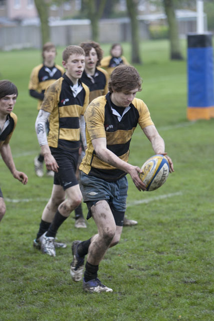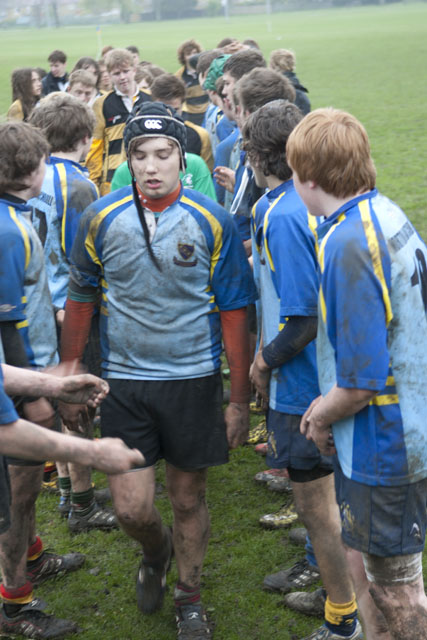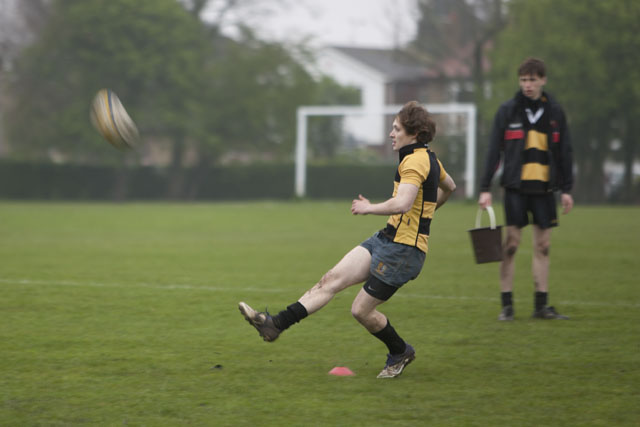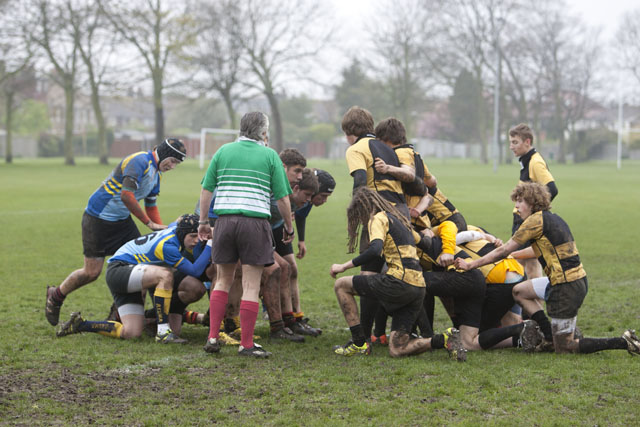 Nobody was about to give up and as time moved on Court's resolve seemed to strengthen and Knatchbull made more and more simple errors, halting their momentum. All the while the Thanet backs remained a threat despite all the tackling and constant reorganising of the defensive line they still intermittently broke out with adventure. When they did so it pushed Knatchbull back deep in their half and they had to begin their slow grind all over again, it must have been soul destroying. Death by a thousand cuts, although it was tackles, tackles, tackles and turnovers that led to the bleeding of confidence and the gathering mist of an impending defeat seeping into tiring minds.So the game continued on a big, muddy, energy sapping Thanet Wanderers pitch, occasionally the Ashford boys kicked for position only to see every high ball caught and returned with interest via boot or slick handling and determined running. The forward pounding continued with Dane Court's own pack taking hit after hit, making tackle after tackle ensuring their opponents worked hard for every yard. A pedantic referee whistled regularly, penalising players of both sides to the ire of all supporters but this just ratcheted up the tension on and off the pitch. Several accidental blood injuries occurred and Jordan Box had to be substituted following a late tackle but the game was never dirty and remained within the code. Both sides took the big hits well showing no hint of the petty recriminatory behaviour that sometimes occurs with less disciplined players.