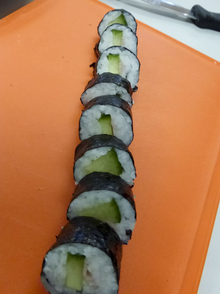 - Place the sushi roll onto the chopping board and cut into pieces (sizes depend on your preference).