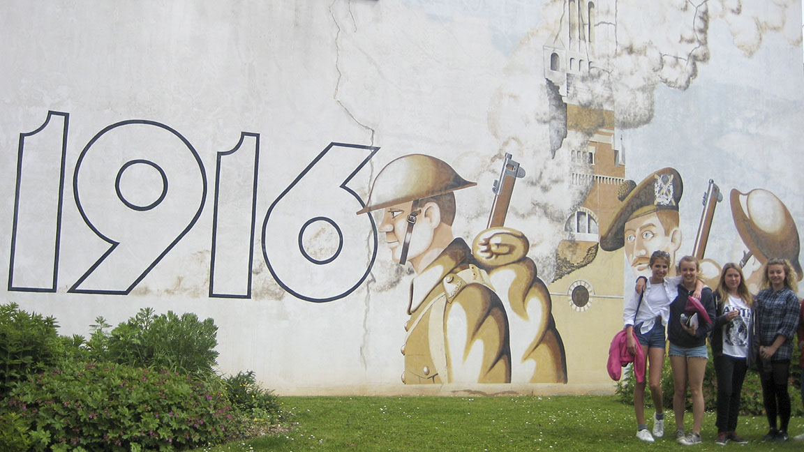 On the fourth and final day of our trip we visited the Musée Somme 1916 in Albert. Upon our arrival we immediately delved into the depths of a vast network of underground war-time tunnels. The guide then talked of a range of historical facts throughout the war, from the effectiveness of the American Browning M1917 to the war’s deadliest battles. After this humbling experience we were then briefed on the load out and gear of a World War One soldier. As we strolled through the trenches we were greeted by a majestic caribou towering above us standing tall on a spiralling tower of stone. We visited a couple of graveyards commemorating the lives lost of the War. We then plunged into the surrounding countryside, passing the fields of poppies and barley. In the French countryside we stumbled across a small gathering of people surrounding a monumentally large crater in the ground. The Lochnagar Crater had been created by a British Royal Engineer’s bomb which had scattered debris and dirt around the site in every possible direction. The bomb which had been set off was, at the time, the largest man-made sound ever heard. This gave us the opportunity to truly appreciate the events of the war.